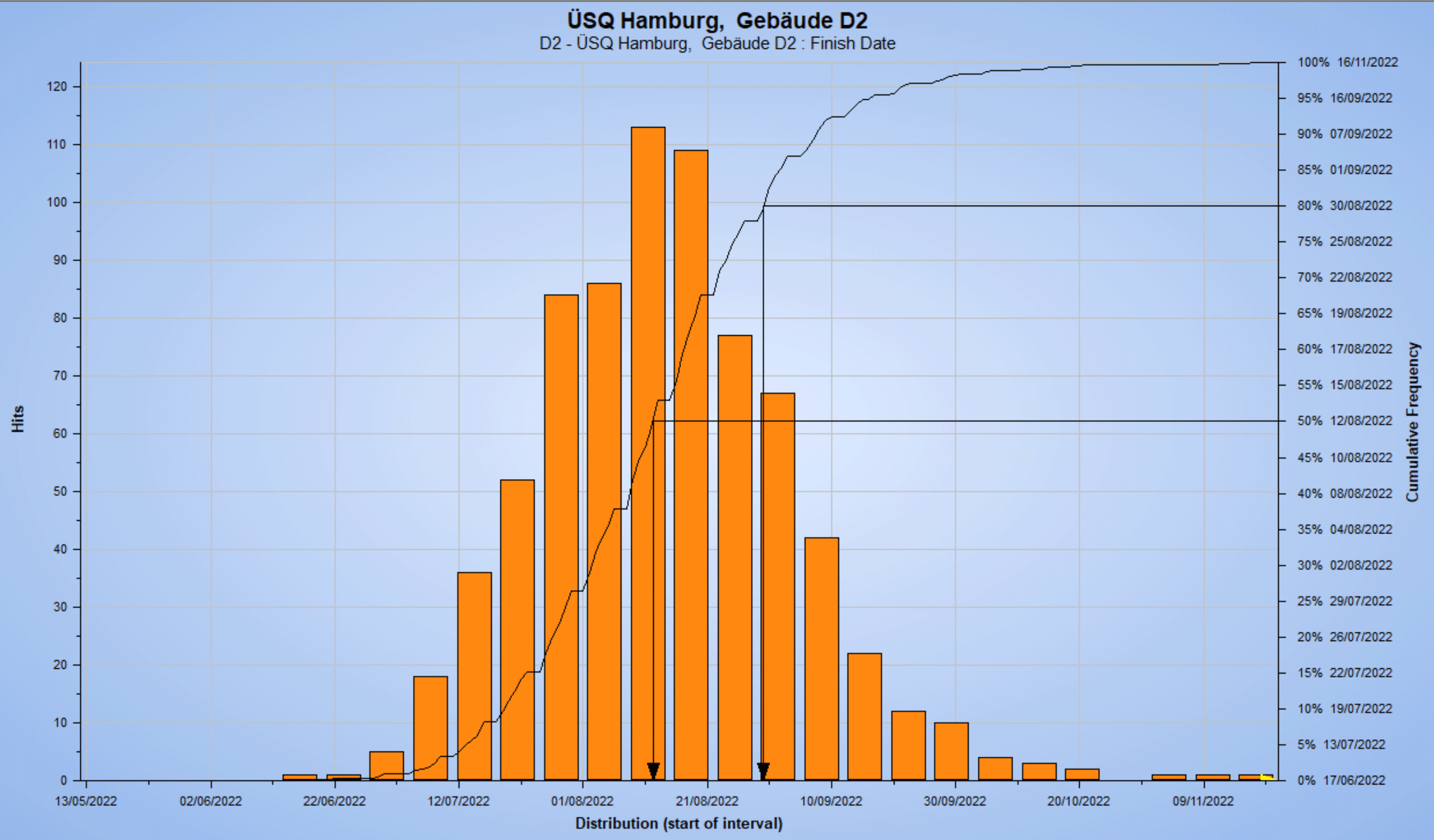 Ein Histogramm der Termin-Treffer der Simulationen lässt die Art der Verteilung erkennen. Aus deren Summenkurve lassen sich die Wahrscheinlichkeiten für das Erreichen der Termin- und Kostenziele auslesen.