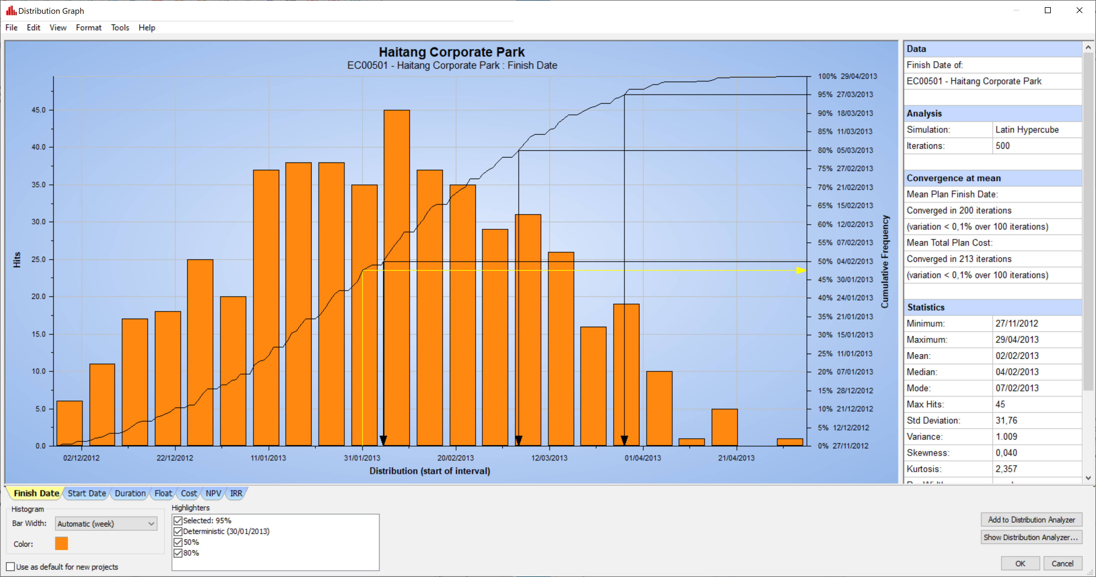 Berechnete Wahrscheinlichkeitsverteilungen für das Projekt und seine Bestandteile als Histogramm: Distribution Graph