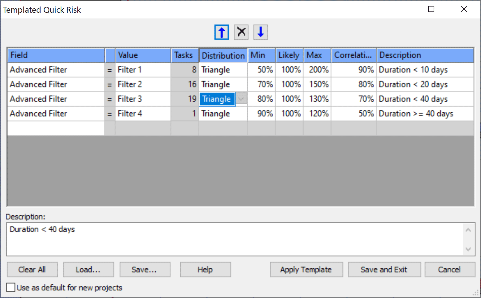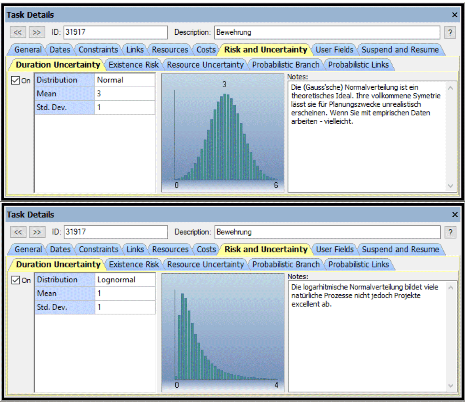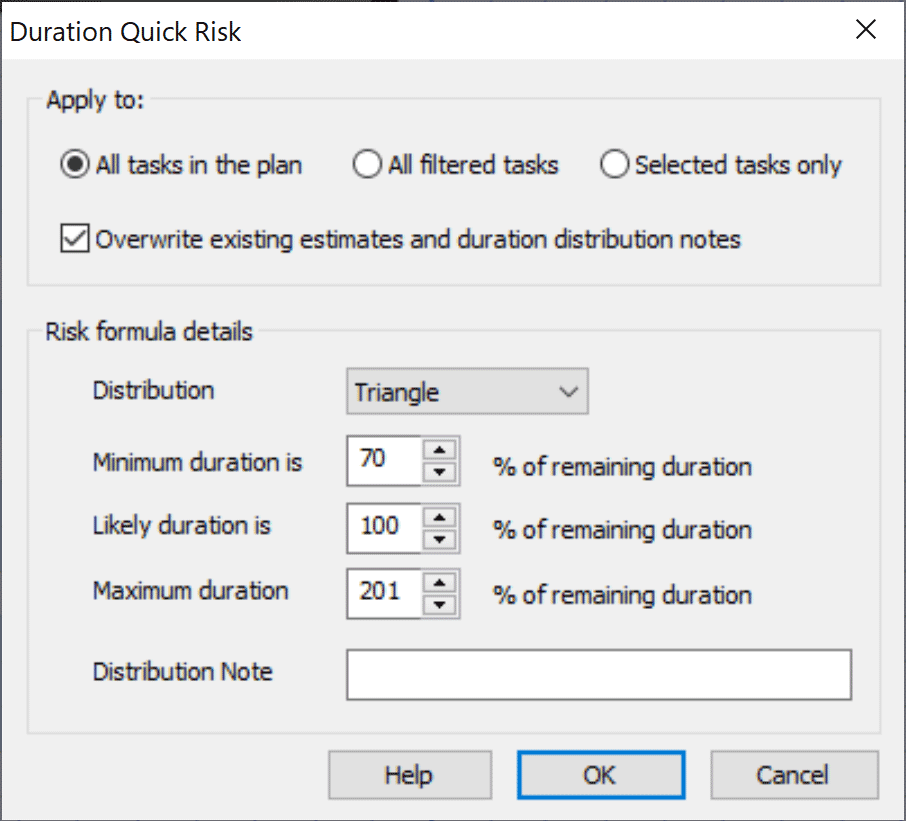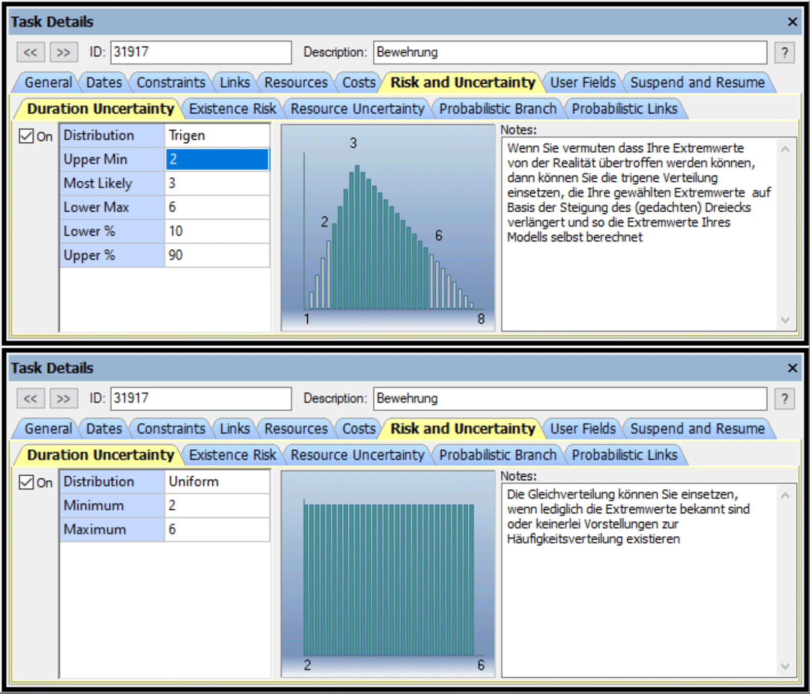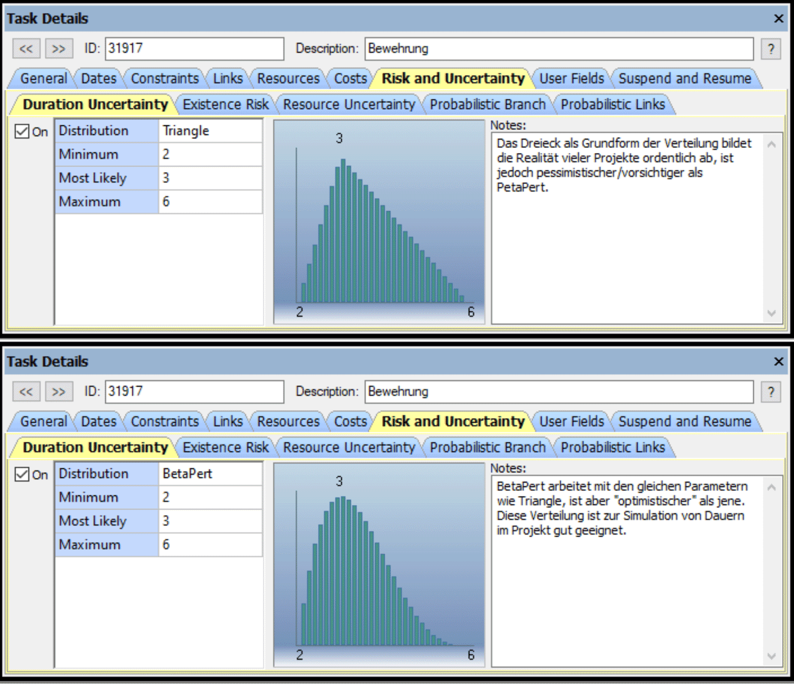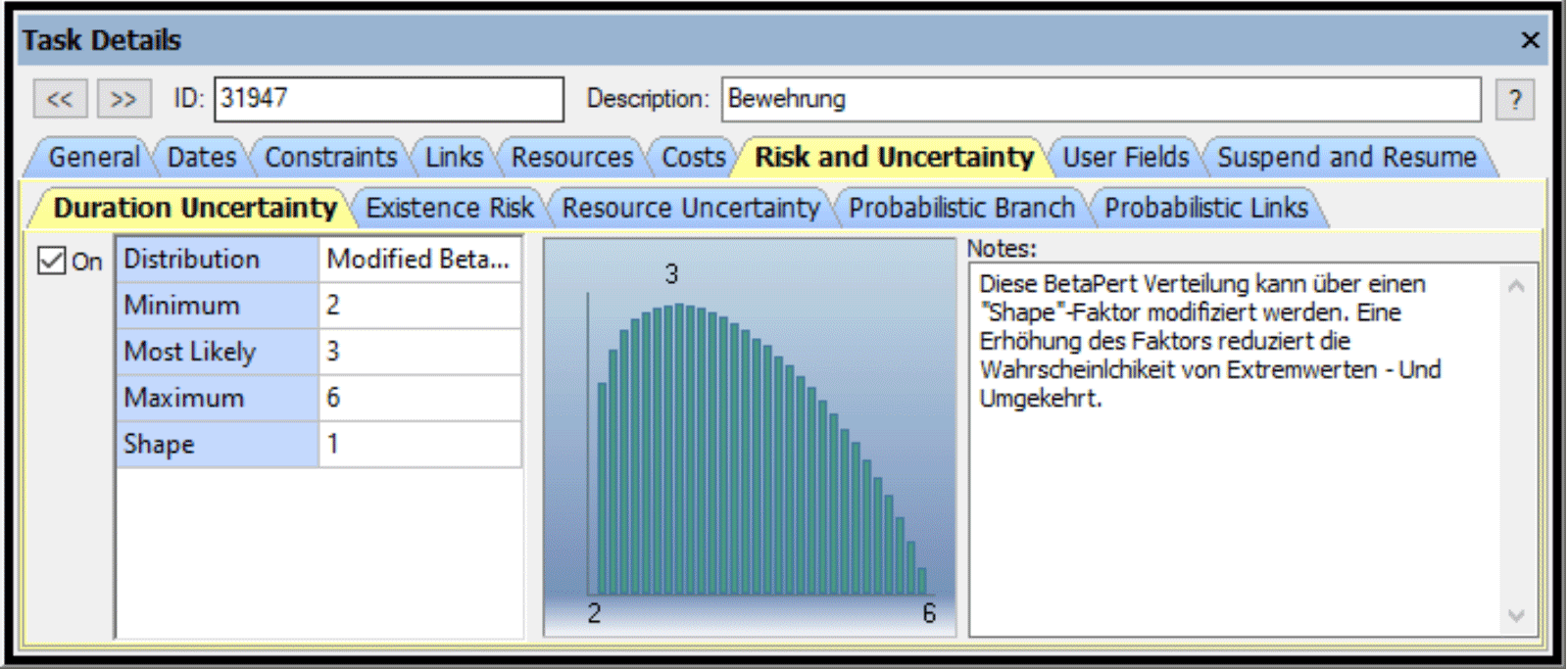 Minimale-, Wahrscheinlichste- und Maximale-Dauer (Arbeit, Kosten) von Aktivitäten können in absoluten Zeiteinheiten, oder unter Bezug auf die Wahrscheinliche Dauer (=100), als Prozentsätze definiert werden. In RISK ANALYSIS können diese mittels "Duration Quick Risks" bequem auf alle Aktivitäten des Projektes angewendet werden. Dieses "schnell und schmutzig" erstellte Risikomodell kann dann durch abweichende Min-Max Dauern für einzelne Vorgänge verfeinert werden. des Projektes Das derart Min attributierte Projekt