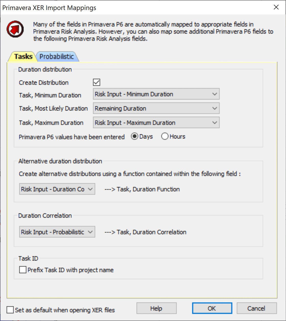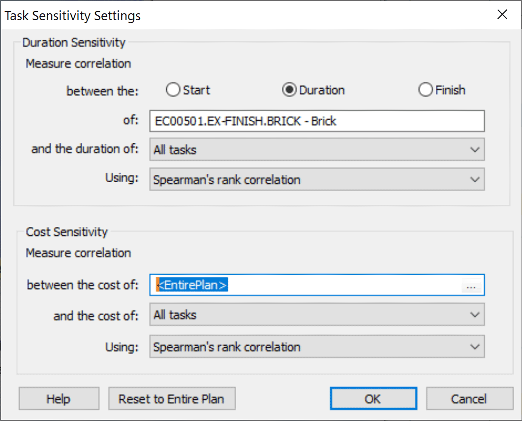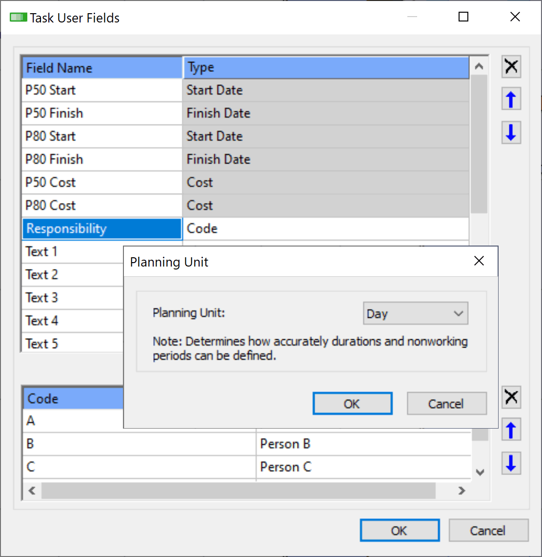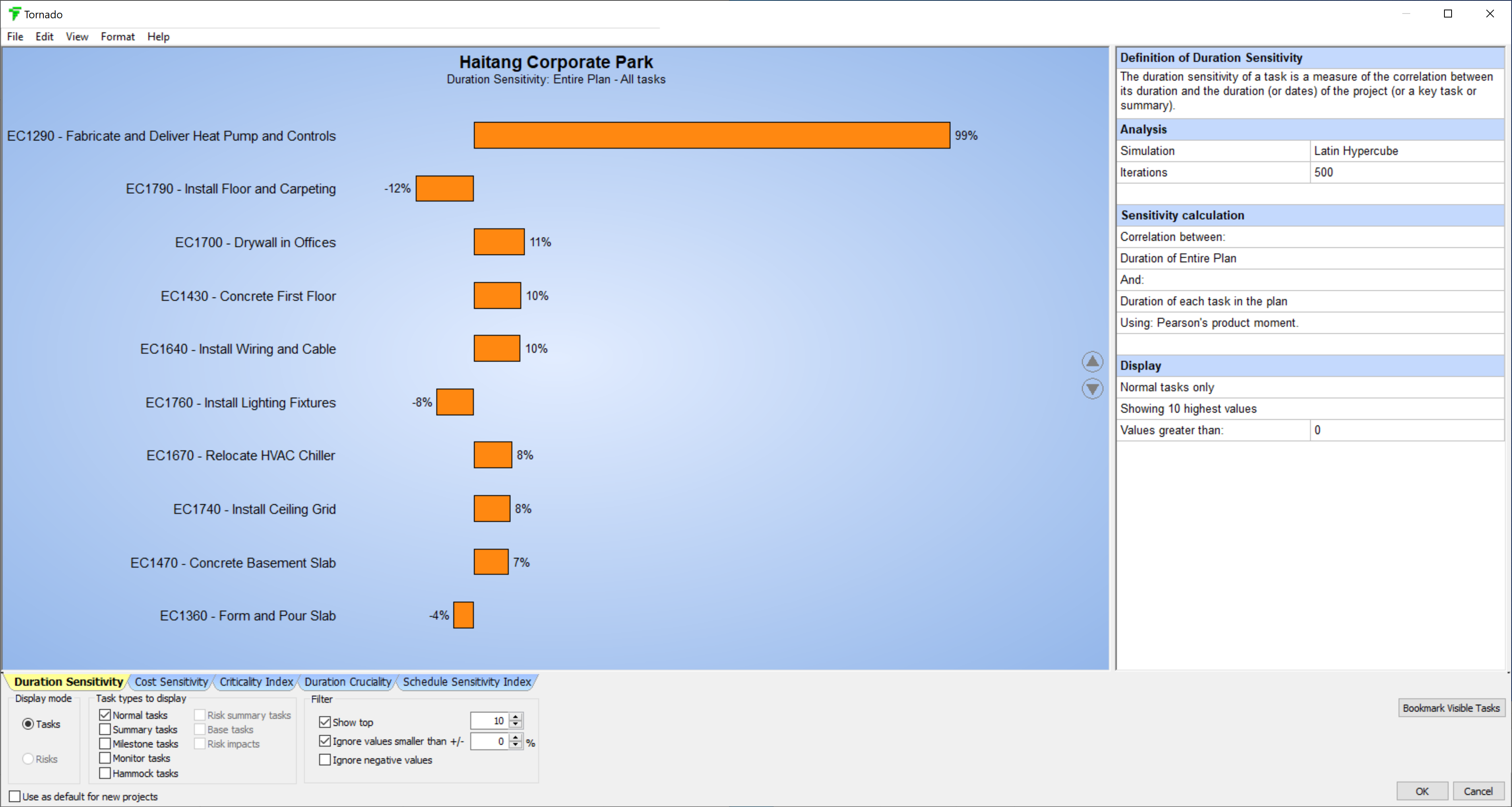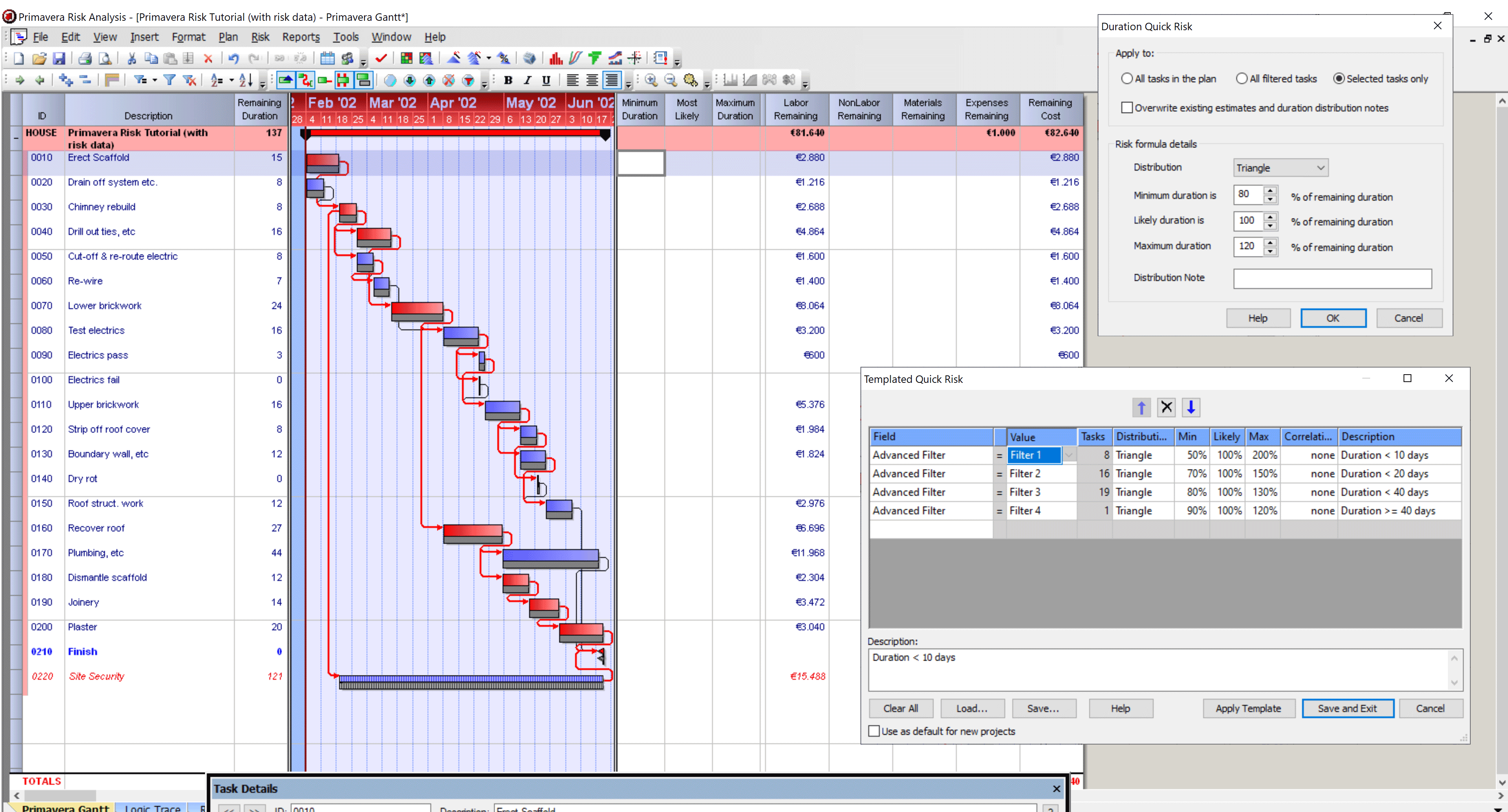 Minimale-, Wahrscheinlichste- und Maximale-Dauer (Arbeit, Kosten) von Aktivitäten können in absoluten Zeiteinheiten, oder unter Bezug auf die Wahrscheinliche Dauer (=100), als Prozentsätze definiert werden. In RISK ANALYSIS können diese mittels "Duration Quick Risks" bequem auf alle Aktivitäten des Projektes angewendet werden. Dieses "schnell und schmutzig" erstellte Risikomodell kann dann durch abweichende Min-Max Dauern für einzelne Vorgänge verfeinert werden. des Projektes Das derart Min attributierte Projekt