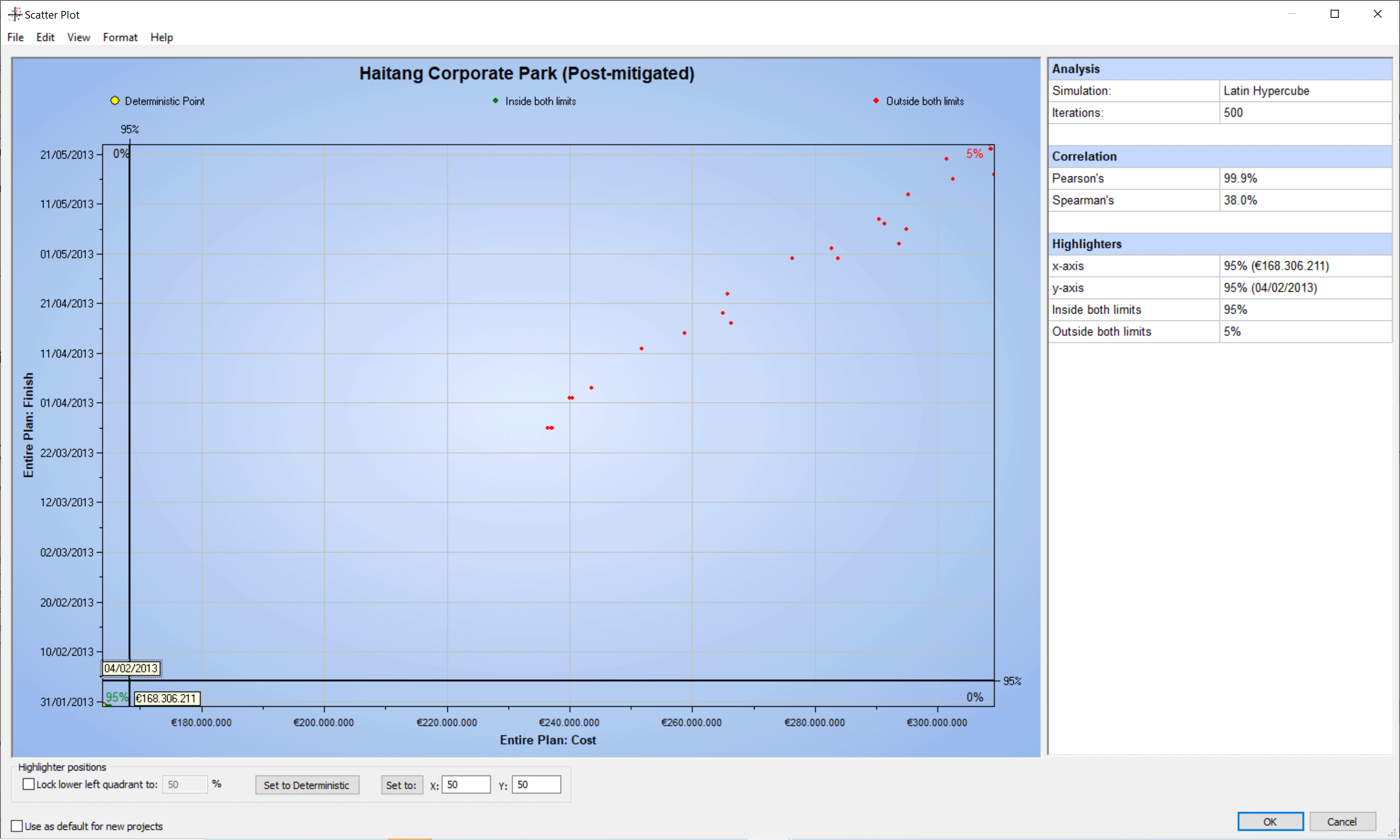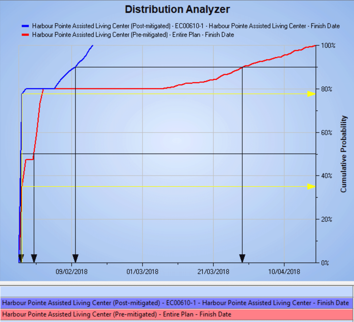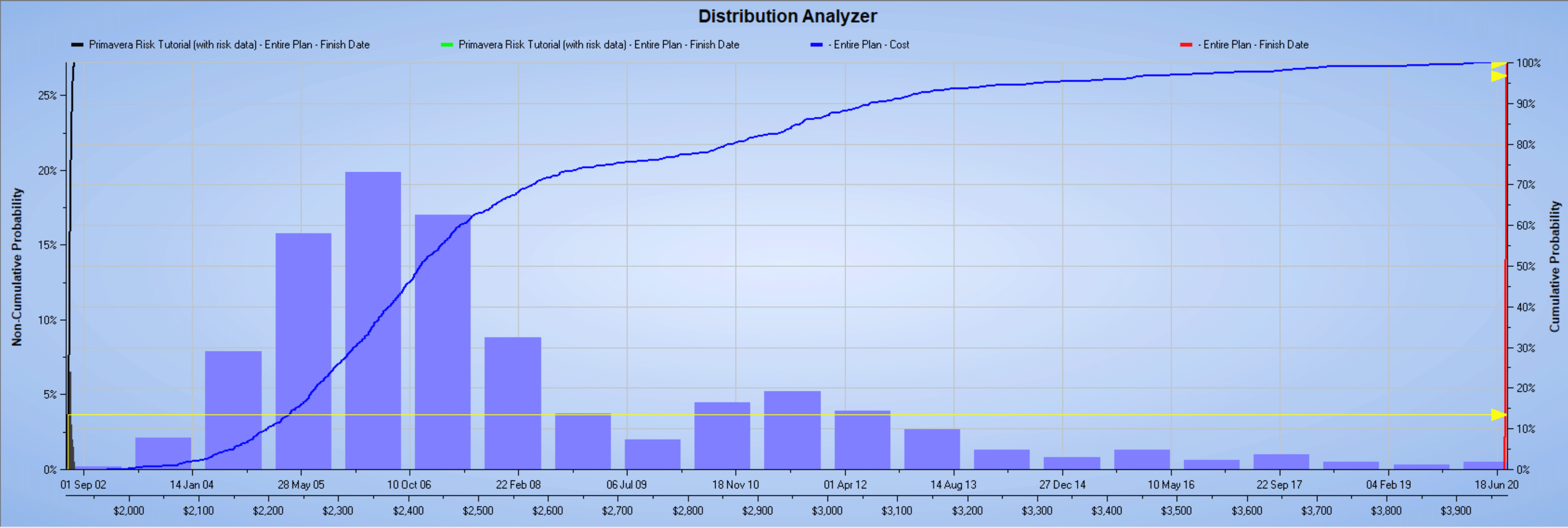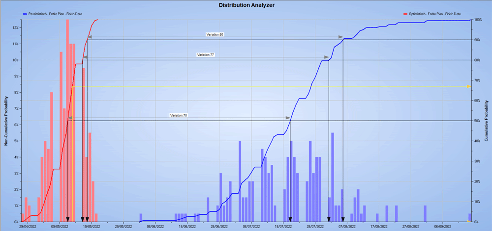 Um die Wahrscheinlichkeit zu ermitteln mit der Projektziele erreicht werden können, rechnet Primavera Risk Analysis Ihre Projekte Annahmen vielfach durch, speichert die Einzelergebnisse zwischen und kann diese z.B. als "Pivot -Projektplan" Risiko-Histogramm visualisieren. Vielleicht liegt nach der Analyse die Wahrscheinlichkeit (Probability P) dass Sie den von Ihrem Planungstool berechneten Endtermin für Ihr Project realisieren können bei 50% (P50). Die Analyse hat aber auch ergeben, dass Sie das Projekt zwei Wochen später mit 80%iger Wahrscheinlichkeit (P80) fertigstellen können.
