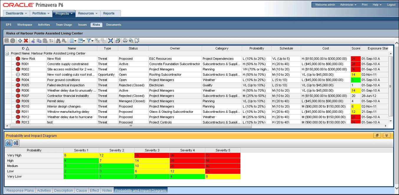 Mit P6 RISK können Sie identifizierte Risiken (und Chancen) in Bezug auf deren Auswirkungen auf den Termin- und Kostenplan bewerten und organisatorisch verwalten. Risikomanagement in Projekten beschäftigt sich mit Aktivitäten welche zur Verhinderung von ungeplanten Ereignissen beitragen, die den Projektverlauf gefährden. Dabei werden die Aufwände zur Risikominimierung oder des (mit der Eintrittswahrscheinlichkeit gewichteten) Schadens bei Risikoeintritt abgewogen und qualitative Maßnahmen und Tendenzen für den Termin- und Kostenplan abgeleitet.