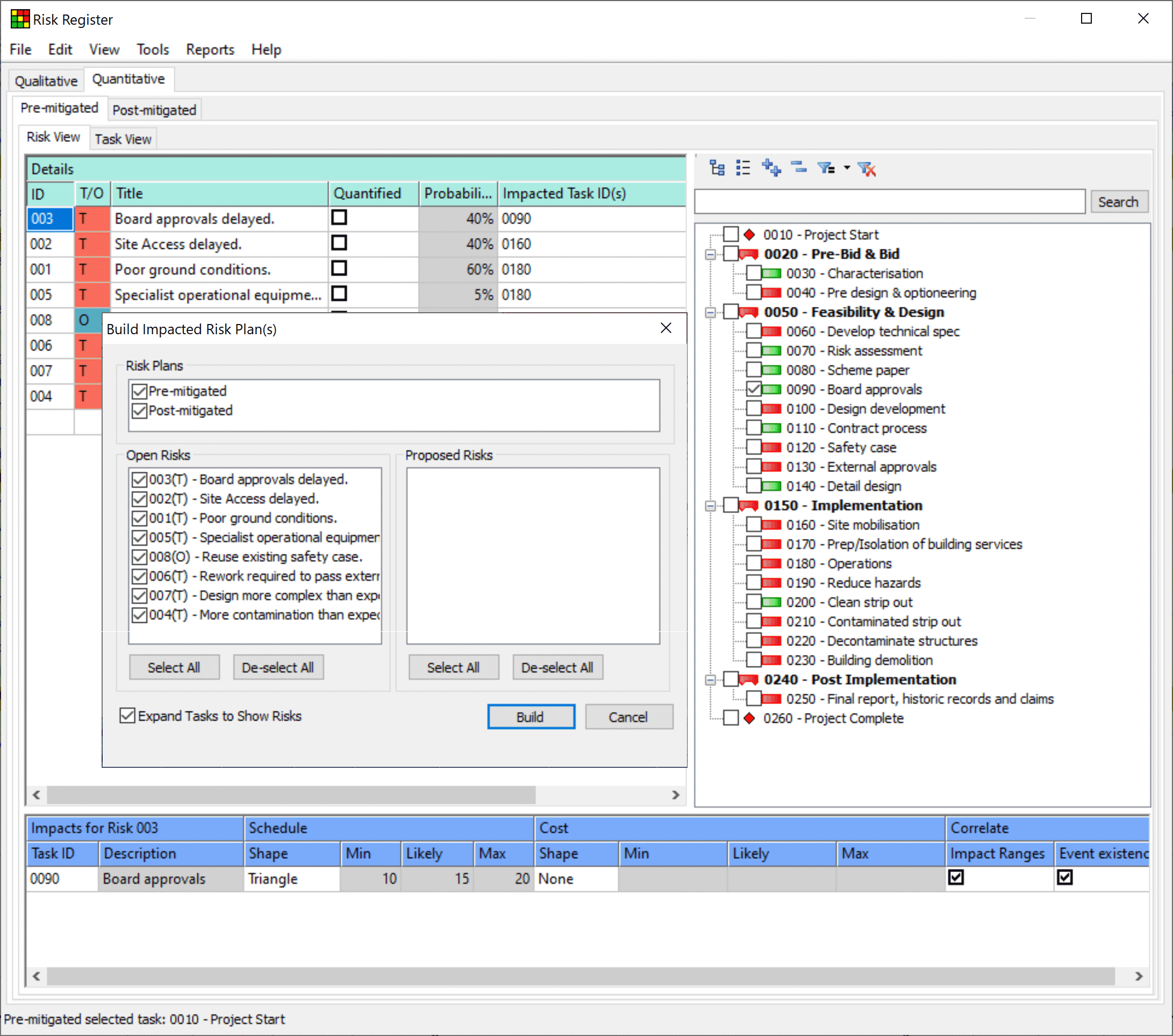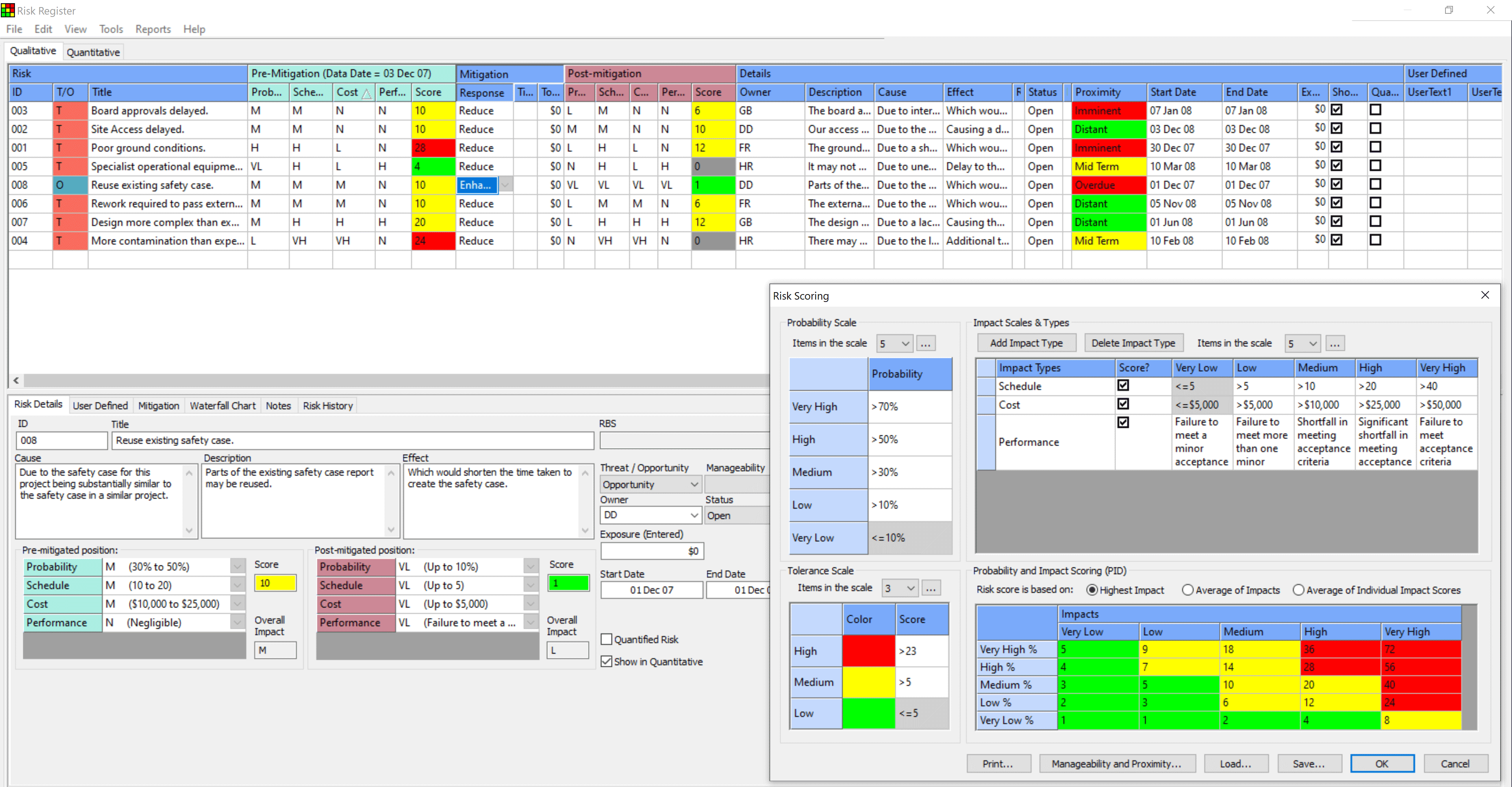 Primavera P6 Professional/EPPM unterstützen den Prozess von der Risikoidentifikation über die Risikoabschätzung bis zum Risikomanagement mit eigener Funktionalität. MS-Project kann dafür mit Ad-Ins wie z.B. RiskyProject aufgerüstet werden. Letztendlich jedoch ist dies ein ein qualitativer Arbeitsschritt der Erfahrungen aus früheren Projekten, einen Austausch zwischen Management, Projektleitung und Projektteam, die Befragung von externen Experten oder fachkundigen Mitarbeitern, sowie ggf. die Orientierung an bestehenden Risikobewertungen voraussetzt. Dieser Arbeitsschritt kann auch mit Excel oder Papier gegangen werden.