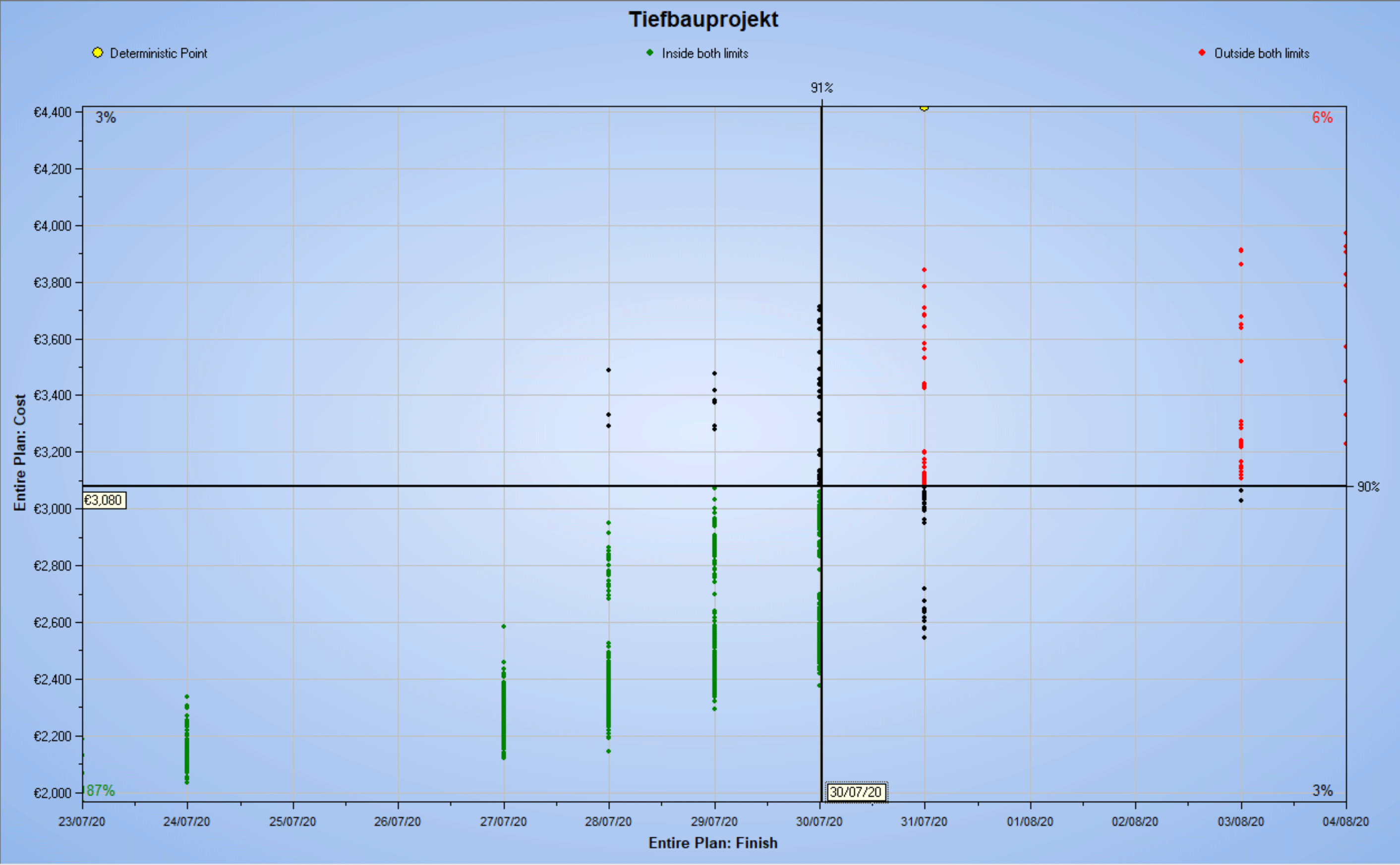 Wenn Risiken im Projekt qualitativ identifiziert und quantitativ bewertet wurden, dann können diese Erkenntnisse pauschal oder differenziert auf den Terminplan projiziert werden, der dann mit Hilfe vieler zufällig erzeugter Varianten des Projektplans vielfach berechnet wird. Aus den summierten Ergebnissen der Simulationen lassen die Wahrscheinlichkeiten für einzelner Termine der von der Terminplanung ermittelten Daten genau so auslesen, wie umgekehrt die Termine für bestimmte Wahrscheinlichkeiten. Falls hinterlegt, gilt dies auch für Arbeit und Kosten. Risikomanagement beinhaltet die systematische Erfassung, Bewertung und Verarbeitung von Risiken im Projekt
