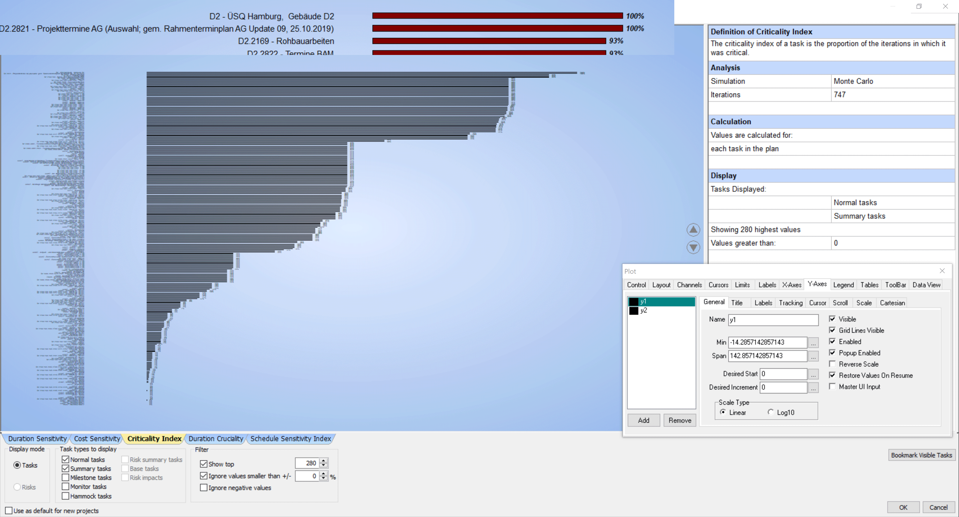 Mit RISK ANALYSIS erstellen Sie auf Basis des „Gesetzes der großen Zahl“ ein einfaches oder (unter Einbeziehung der identifizierten qualitativen Risiken) auch hochkomplexes Risikomodell des Terminplans, der von der Software unter verschieden Min-Max z.B. 1000 mal mit Zufallsvariablen durchgerechnet wird. Im Ergebnis stehen quantitative Aussagen wie: „Dieser Turnaround wird mit einer Wahrscheinlichkeit von 10% am 30.12.21, mit 50% am 15.1.22, mit 90% am 13.2.22 fertiggestellt sein.
